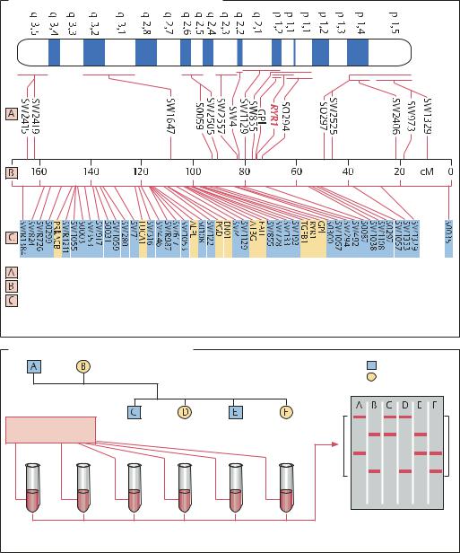 Соответствие физической карте (отрезкам ДНК). Синие: микросателлиты (маркерные локусы), |