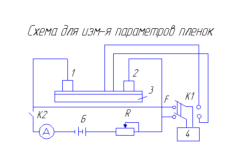 Исследуемую пленку наносят на диэлектрическую подложку 3 (стекло, керамика). В качестве контактов 1 и 2 исп-ют никелевые стержни. В цепь включены батарея Б, и амперметр А. Ключом К2 подают напряжение батареи на контакты 1 и 2. Разность потенциалов 1 и 2 измеряют мостом 4. Для коммутации измерения исп-ся тумблер К1. При помощи простых вычислителей опред-ют электр-ие параметры.