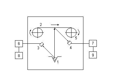 Поток атомов Ме от испарителя 1 попад. на подложку 2, кот. Перемещается при ком. лентопротяж. механизма 5. При этом записывается скорость движения пленки. Атомы испаренного Ме попадают на датчик 3. При этом измеряется ск-ть испарения Ме при помощи прибора 8. При попаданиипотоков атома от испарителя на подложку, часть атомов отражается от ее поверхности. Отраженный поток атомов попадает на датчик 4- ск-ть фиксир-я прибором 9. отношение масс отраженных и испаренных атомов хар-т коэф-т конденсации Ме и соот-но рост пленки в процессе ее получения. Естественно эта информация м.б. использована для упр-я произв-м напыления.