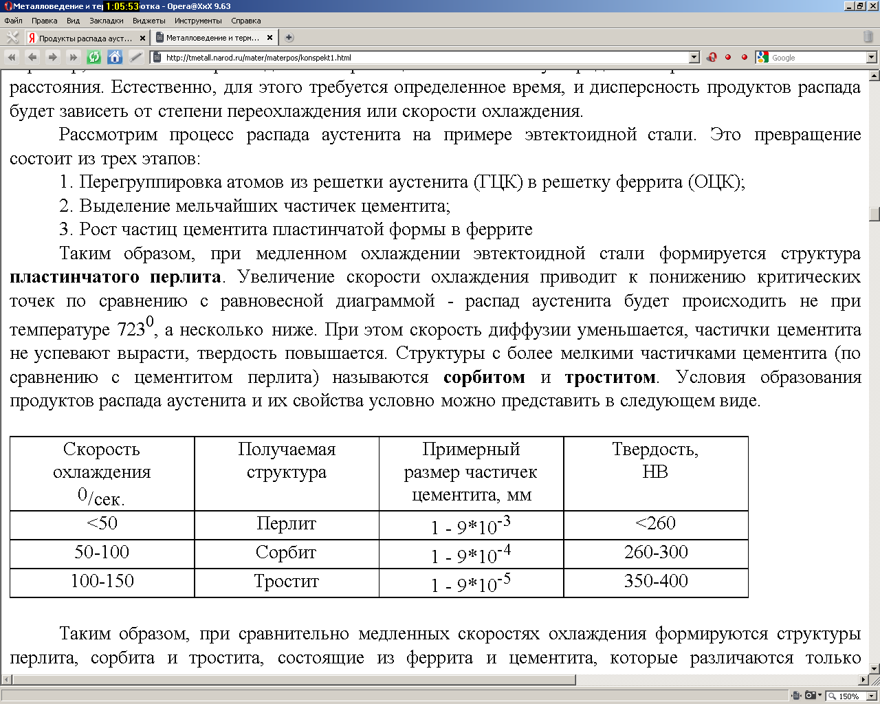 Таким образом, при медленном охлаждении эвтектоидной стали формируется структура пластинчатого перлита. Увеличение скорости охлаждения приводит к понижению критических точек по сравнению с равновесной диаграммой - распад аустенита будет происходить не при температуре 7230, а несколько ниже. При этом скорость диффузии уменьшается, частички цементита не успевают вырасти, твердость повышается. Структуры с более мелкими частичками цементита (по сравнению с цементитом перлита) называются сорбитом и троститом. Условия образования продуктов распада аустенита и их свойства условно можно представить в следующем виде.