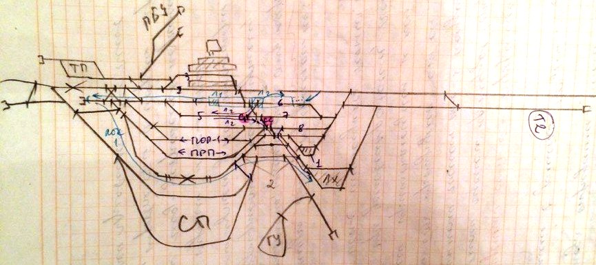 Соединенный четный поезд принимаем на пути 5 и 7. После расцепки поезд №2 оттягивается назад до освобождения стрелки 1; после закрепления состава лок-в от поезда №2 через стр1 и съезд 2 уходит в ЛХ. После закрепления состава поезда №1, его локомотив уходит в тупик Т2 и далее в ЛХ. Новый локомотив подается также.