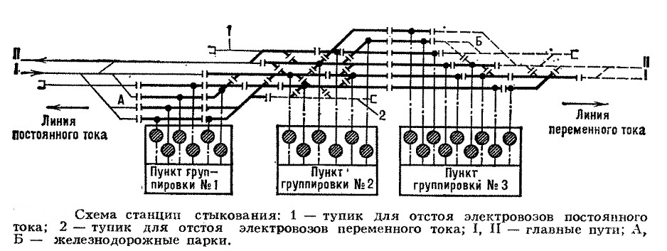 На УС, превращаемой в станцию стыкования, нередко также осложняется размещение ПТОЛ постоянного или переменного тока, поэтому на станции стыкования можно проектировать отдельные парки, оборудованные контактной сетью только 1 системы тока; при этом передача составов из 1 парка в другой должна осуществляться специально выделенными для этой цели тепловозами, что существенно увеличивает эксплуатационные расходы. Число приемоотправочных путей в четном и нечетном парках на такой станции определятся также, как и на УС.