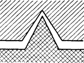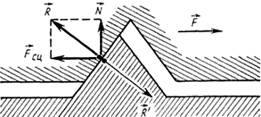 Рассмотрим более детально процесс возникновения сил трения скольжения и покоя на стыке двух соприкасающихся тел. Если посмотреть на поверхности тел под микроскопом, то будут видны микронеровности, которые мы изобразим в увеличенном виде (рис.1,а)Рассмотрим взаимодействие соприкасающихся тел на примере одной пары неровностей (гребень и впадина).