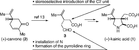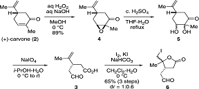 (+)-Карвон является представителем терпенов, и, как известно, подвергается окислительной деструкции, что, в итоге, даёт универсальный синтетический промежуточный продукт(3). Предположили, что продукт(3) имеет пригодные функциональные возможности для стереоселективного введения заместителя по положению С2, внедрения атома азота, а также для формирования кольца пирролидина.