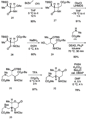 Активация кольца β-лактама с группой Cbz (карбобензоксильная защитная группа) с последующим восстановлением с помощью NaBH4 дает аминоспирт(29). Вводится глицин, затем проводится реакция по Мицунобу с нозил(Ns)-активированным сложным эфиром(30) для получения вещества(31). При обработке трифторуксусной кислотой происходит циклизация соединения(31) с последующим образованем вещества(32). Наконец, происходит переход из нозильной группы в Boc-группу, что в итоге даёт желаемый продукт(33) с 46% общим выходом из соединения(25).