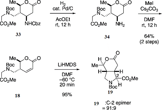 После удаления группы Cbz из соединения(33) путём гидрогенолиза, полученный первичный амин обрабатывали 10-кратным молярным избытком йодистого метила в присутствии карбоната цезия. Затем идёт удаление группы NH2, вследствие чего образуется желаемый α,β-ненасыщенный лактон(18) с 64% выходом (Схема 7).