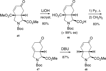 Транс-4-гидрокси-L-пролина был преобразован с выходом 93% в N-Вос-производное метилового эфира(40), который был окислен до соответствующего кетона с выходом 85%. Затем был получен региоселективно трифталат (41) и с высоким выходом из этого кетона с NaHMDS-PhNTf2.