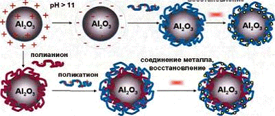 ПЭ способны формировать на поверхности различных носителей как моно-, так и полислоевые покрытия. Такие ультратонкие слои могут рассматриваться как наноразмерные реакторы, в которых рост наночастиц металлов ограничивается толщиной слоя. Однако, необходимо отметить, что в этом случае поверхность твердого носителя (например, Al2O3, SiO2) должна нести определенный заряд. Так при однократном нанесении катионного ПЭ (ПДАДМАХ или хитозана) необходимо наличие отрицательного заряда на поверхности окиси алюминия, для получения которого исходная окись алюминия обрабатывается водным раствором щелочи. Такая обработка приводит к перезарядке поверхности (перемене знака электрокинетического потенциала), что значительно улучшает электростатическое взаимодействие с катионным ПЭ. Ионы металла включаются в пленку ПЭ и затем восстанавливаются, формируя наночастицы (Рис. 9, верх). Но описанный метод однократного нанесения имеет ряд недостатков, главным из которых является недостаточно прочное закрепление ПЭ на поверхности носителя, в результате чего в процессе использования такого наноструктурированного материала, часть ПЭ слоя может смываться, а система - терять свои первоначальные свойства.