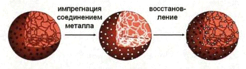Наличие нанопор или нанопустот стандартного размера и формы в полимерной матрице создает поверхности раздела между объемом пор и стенками полимера - наноструктуры, которые могут служить нанореакторами для роста частиц. В этом случае размер частиц может ограничиваться размером пор [40]. На рисунке 11 показана схема формирования наночастиц металлов в пустотах (порах) сверхсшитой полимерной матрицы СПС.