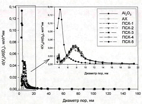 Если сравнивать результаты адсорбции азота для синтезированных образцов с чистой окисью алюминия, очевидно, что при нанесении ПЭ изменяется размер пор: появляются мезопоры со средним диаметром около 8 нм, тогда как чистый носитель - мезопористый со средним диаметром пор около 4,5 нм (Рис. 16). Предполагается, что наносимый ПЭ может проникать в поры γ-А12О3 диаметром около 4,3 нм, вызывая их расширение [75]. При этом важно отметить, что распределение пор по размерам для АХ и нанокомпозитов серии ПСХ одинаково, то есть нанесение второго слоя ПЭ не вызывает дальнейшего расширения пор носителя.