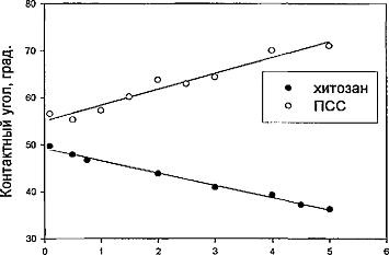 Зависимость величины контактного угла растворов хитозана и ПСС, нанесенных на γ-А12О3,
