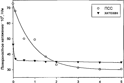 Зависимость величины поверхностного натяжения растворов хитозана и ПСС от