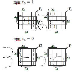 Виходячи із формул 2.1-2.4 будуємо діаграми Вейча (рис. 2.1) для мінімізації отриманих логічних функцій. Визначаємо такі контури функцій Y1 і Y2, які можуть бути реалізовані у схемі синтезованого пристрою загальними елементами.