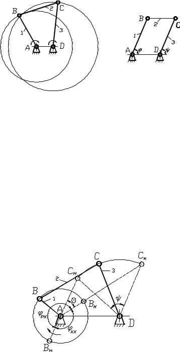 Частным случаем является механизм шарнирного параллелограмма (рис. 1, б), у которого АВ = СD и ВС = АD, углы поворота ведомого ψ и ведущего ϕ звеньев будут равны в любом положении, т.е. звенья 1 и 3 вращаются с одинаковой скоростью и передаточное отношение U13 постоянно и равно единице.