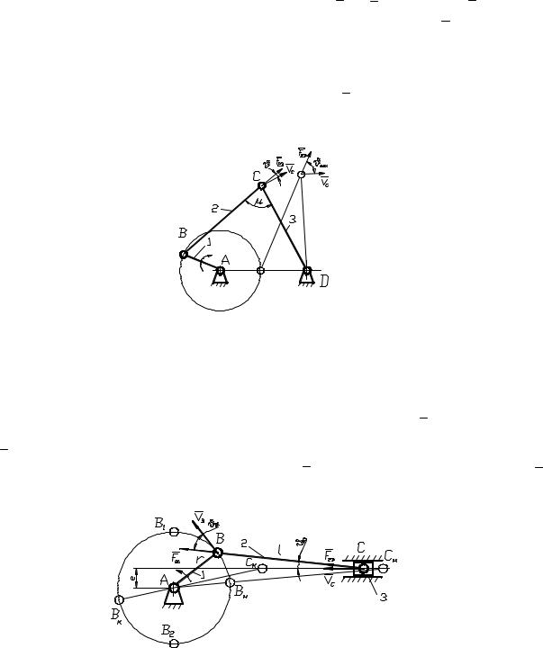 Вшарнирном четырёхзвеннике угол давления ϑ образован векторами F23 и VС (рис. 7). Сила F23 , действующая со стороны шатуна 2 на коромысло 3, направлена вдоль шатуна. Направление скорости VС точки С коромысла перпендикулярно звену 3. Угол μ, дополняющий угол давления до 90° называется углом передачи: μ = 90 − ϑ .