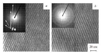 Рисунок 9 - Микрофотографии (просвечивающий режим) и электронная дифракция (на врезках) нанонитей железа в матрице мезопористого диоксида кремния, полученных УФ-облучением в вакууме (а) и дополнительной кристаллизацией при температуре 375°С (b)