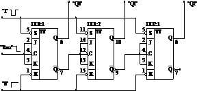 импульса. Вход старшего разряда счетчика связан с прямым выходом (Q) младшего соседнего разряда.