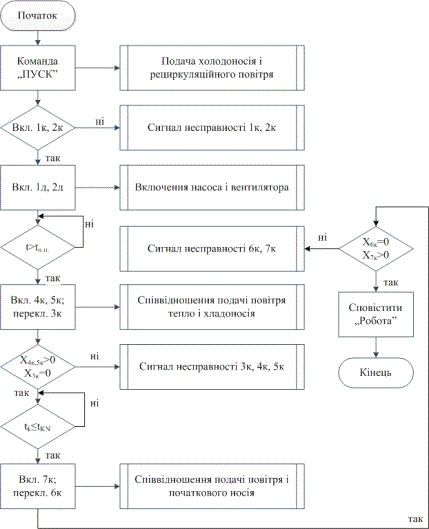 У відповідності з завданням розроблена блок-схема алгоритму програмно-логічного управління процесом пуску кондиціонера повітря, згідно якого по ініціативному сигналу «Пуск» система автоматизації повинна виконувати: