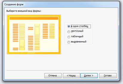Форма - это специальный объект-контейнер для других интерфейсных компонентов, таких как поля ввода и отображения данных, кнопки и др. На форме разработчик располагает компоненты для ввода, корректировки, просмотра и группировки данных, в зависимости от специфики приложения. Форму также можно создать двумя способами в режиме конструктора и с помощью мастера. В первом случае разработчик располагает набором компонентов (при необходимости можно зарегистрировать свои ActiveX), которые свободно размещает на форме и задает их параметры. В режиме мастера пользователь просто выбирает таблицу, поля и стиль оформления, а форма генерируется автоматически.