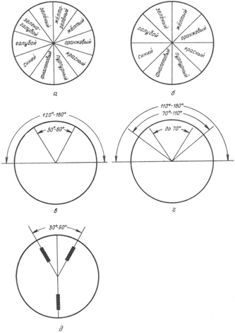 большой (120-180°) и малый (30-60°) интервалы цветового круга, г - дуговые