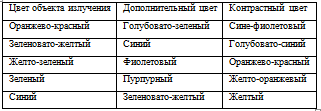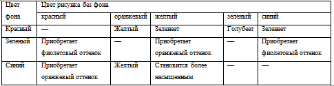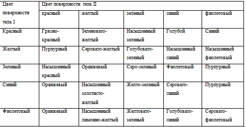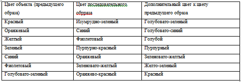 При переносе взгляда с одного хроматического цвета на другой происходит суммирование цвета последовательного образа с цветом второго тела. Получающееся в результате этого восприятие приведено в таблице.