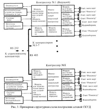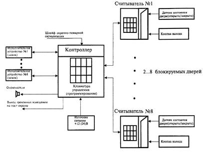 Типовые схемы СКУД в основном соответствуют их классификации, приведенной в п.1.1. Общая структура имеет практически одинаковую типовую основу. Различие структуры может быть вызвано требованиями к способу управления (автономные, централизованные или сетевые и универсальные).