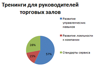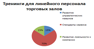 Отметим, что в компании выделяют тренинги для торгового персонала и для сотрудников офиса. Тренинги для торгового персонала подразделяются на тренинги для линейного персонала, то есть для продавцов-консультантов, продавцов-кассиров и т.д. Для данной категории сотрудников проводятся такие виды тренингов, как основы мерчендайзинга, стандарты сервиса, тренинг по продажам. Второй категорией торгового персонала являются руководители торговых залов. Для них проводятся тренинги по наставничеству, удержанию персонала, по лидерству и базовым управленческим навыкам.