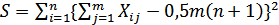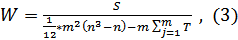 Где: m - число экспертов; n - число ранжируемых объектов; S - сумма квадратов отклонений всех оценок рангов каждого объекта экспертизы от среднего значения, которая рассчитывается по формуле (2); t - число