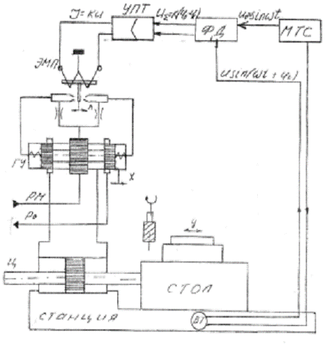 Объект управления - стол станка с закрепленной деталью - перемещается по направляющим с помощью силового цилиндра Ц. Инструмент производит обработку детали, которая должна двигаться с подачей, запрограммированной, например на магнитной ленте.