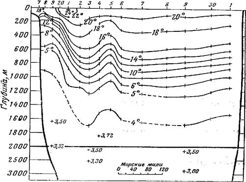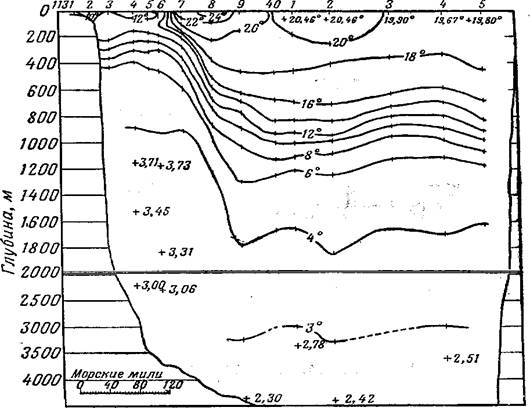 тёплые воды более холодными, под течением уже на глубине 400 м. температура