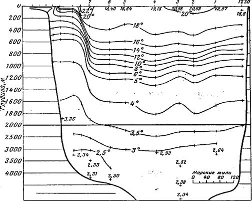 составляет +12°С, левая сторона течения. На глубине ниже 2000 метров