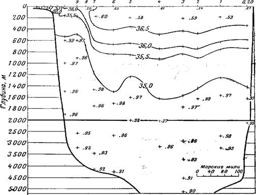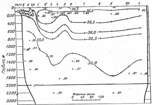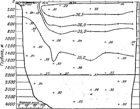 Рис. 2.9. Распределение солености на разрезе через Гольфстрим от Чесапикского залива к Бермудским островам, сделанном 30 ноября - 5 декабря 1932 г. [1]