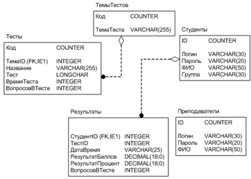 В таблице «ТемыТестов» первичным ключом является поле «Код», информация, находящаяся в этом поле, является уникальной. Данная таблица является родительской для таблицы «Тесты», для неё осуществляется каскадная ссылочная целостность.