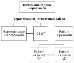 Функциональная организация маркетинга является наиболее простой, однако ее эффективность падает по мере роста номенклатуры выпускаемых продуктов и расширения числа рынков сбыта. Это обусловлено в первую очередь тем, что в функциональной организации отсутствует лицо (кроме самого руководителя подразделения маркетинга, которому помимо маркетинговых проблем приходится решать также много других вопросов), отвечающее за маркетинг отдельных продуктов в целом или за маркетинговую деятельность на определенных рынках.