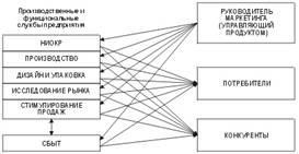 Эта схема не является орг. структурой управления, в ней не представлены конкретные структурные звенья предприятия, а указаны только важнейшие с точки зрения маркетинга функции управления. Руководитель маркетинговых служб выполняет опосредствующие функции между подразделениями и сотрудниками предприятия, занимающимися разработкой продукта, его производством, стимулированием продаж, доведением продуктов до потребителей, послепродажным обслуживанием, с одной стороны, и потребителями продукции - с другой. При этом руководитель маркетинга и его аппарат отслеживают состояние внешней среды маркетинга, обращая в первую очередь внимание на деятельность конкурентов.