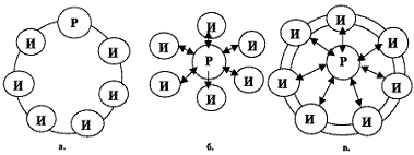 а - кольцо; б - звезда; в - колесо. Р - руководитель; И - исполнитель