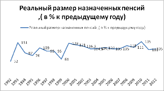 Фактический уровень пенсионного обеспечения характеризуется динамикой пенсий в сопоставимых ценах, отражающей их покупательную способность с поправкой на инфляцию. Реальный размер назначенных пенсий снижался до 1999 года (исключение - 1993г. и 1996 г., когда их уровень по отношению к предшествующему повышался - на 31% и 9% соответственно). Особенно значительно (почти в 2 раза) они уменьшились с 1992 г. С 2000 г. средний размер реальных пенсий увеличивался ежегодно. До 1998 г. увеличение номинальных пенсий отставало от темпов роста потребительских цен; в последующий период динамика номинальных пенсий опережала рост цен на товары и услуги.
