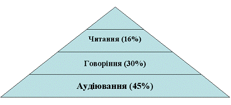 Час, що витрачається людиною на різні види мовленнєвої діяльності, розподіляється приблизно так: аудіювання - 45%, говоріння - 30%, читання - 16%, письмо - 9% (див. Рис.1.1).