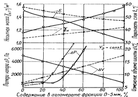 Результаты исследований газопроницаемости слоя материалов, загруженных послойно и в смеси, показали, что при смешивании материалов существенное уменьшение сопротивления столба шихты наблюдается при определенных соотношениях мелких и крупных материалов. В частности, при смешивании производственных агломератов, содержащих 20-30% мелкой фракции (0-5 мм), с коксом потеря напора в слое одинакова. При большем количестве мелочи газопроницаемость смеси значительно выше, чем при послойном расположении кокса и агломерата. В этом случае слой мелкого агломерата являлся определяющим в создании сопротивления проходу газа. При количестве мелочи менее 20% газопроницаемость смеси была хуже, но незначительно (рис. 10).