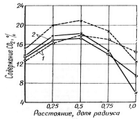Степень смешения была недостаточной, хотя распределение рудной составляющей по радиусу печи было значительно равномерней, чем при обычных системах загрузки (рис. 12).