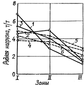 (I - периферия, II - промежуточное сечение, III - центр) при раздельной загрузке (-----) и смесью (- - - -): 1 - ААКК; 2 - КААК; 3 - ААКК; 4 - АКЧАК; 5 - КАЧКА; 6 - смесь