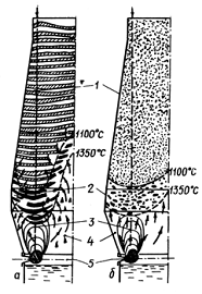 загрузке шихтовых материалов (а) и в смеси (б): 1 - кусковая (сухая) зона