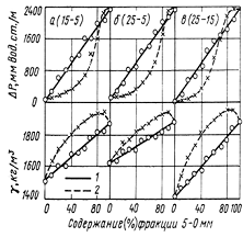 Следует отметить неодинаковый характер зависимости насыпной массы слоя от содержания мелкой фракции. При загрузке слоями (1) изменение получается практически линейным. При загрузке в смеси (2) оно нелинейно. Общая насыпная масса при загрузке обеих фракций в смеси всегда больше, чем при их послойной укладке; следовательно, порозность слоя при смешивании фракций разной крупности уменьшается. Наибольшее различие в величине у по кривым 1 и 2 наблюдалось в серии опытов на рис. 1, в с фракциями 5-0 мм и 25-15 мм, больше всего различавшихся по крупности. При смешивании этих фракций насыпная масса получается на 11-13% большей, чем при послойной загрузке.