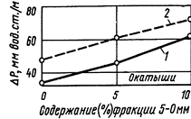 Рис. 17. Изменение газодинамического сопротивления шихты в зависимости от содержания мелочи при послойной загрузке кокса и окатышей (1) и при их загрузке в смеси (2)