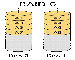 - дані в процесі запису розбиваються на кілька потоків, і кожен потік записується на свій диск. В результаті збільшується швидкість запису і швидкість зчитування інформації, однак при цьому кожен диск містить лише частина набору даних, тому втрата будь-який з частин руйнує весь набір.