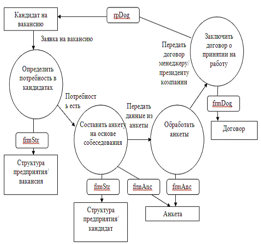 Пример диаграммы потоков данных для задачи подбора персонала силами отдела управления персоналом компании приведен на рис. 3 На DFD модели кандидат на вакансию (внешняя сущность) обозначен прямоугольником, процессы - кругами, хранилища данных - параллельными линиями, потоки данных - стрелками, модули проектируемого приложения - прямоугольниками со скругленными углами. Потоки данных - это прообразы приложений, а хранилища данных таблиц баз данных.