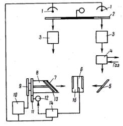 Инфракрасное излучение от двух источников 1 направляется по двум каналам (рабочему и сравнительному), проходя при этом через обтюратор