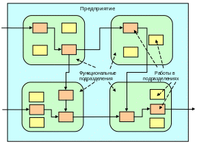 разбиение технологий выполнения работ на отдельные, как правило, несвязанные между собой фрагменты, которые реализуются различными структурными подразделениями предприятия;