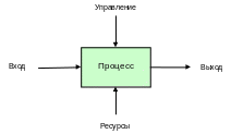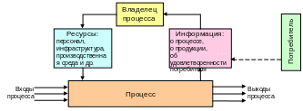 К ресурсам процесса относятся персонал, оборудование, технические системы, вычислительные средства и программы для них, помещения, окружающая среда и другие непреобразуемые факторы процесса. К управлению относятся методы, планы, стандарты, стратегия, законодательства, регламентирующие функционирование процесса, а также управляющие воздействия, реализуемые по ходу его выполнения.