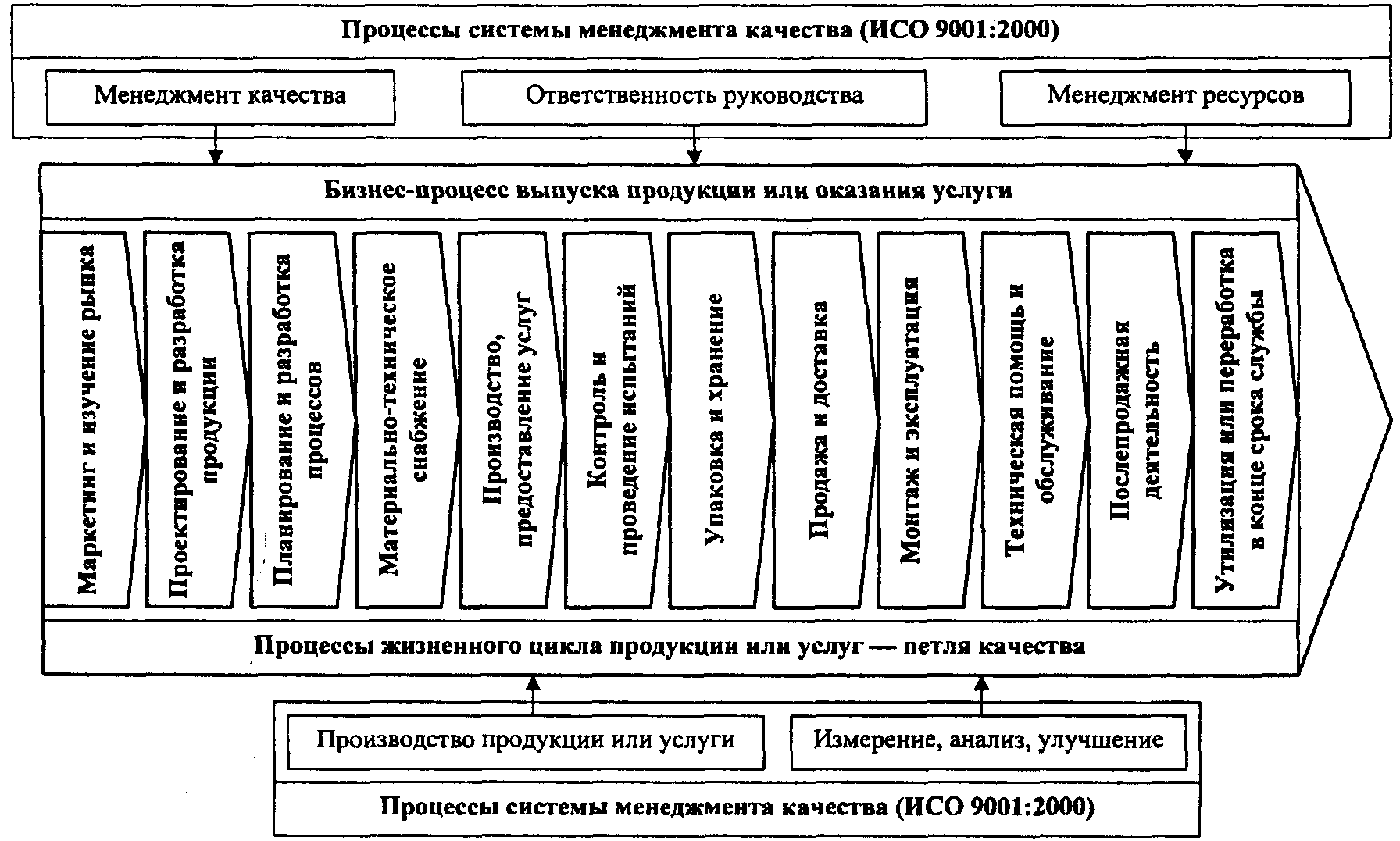 Из схемы видно, что основной процесс производства продукции или предоставления услуги декомпозируется на двенадцать внутренних процессов жизненного цикла продукции (ЖЦП), которые соответствуют «петле качества». Качество и эффективность внутренних процессов обеспечивается внешними процессами системы, которые определены требованиями стандарта ИСО 9001. В соответствии с принципом процессного подхода каждый из внутренних процессов ЖЦП (маркетинг, проектирование и разработка продукции или услуги и др.) должен быть выделен и описан, т. е. простроена его модель: после присвоения имени, идентификации выходных и входных потоков и управляющих воздействий, назначается владелец процесса. Для каждого процесса устанавливается система его управления с обязательным измерением параметров и характеристик. При этом должны быть определены критерии качества процесса. В рамках каждого процесса следует определить список выполняемых ключевых работ (операций), организовать и вести мониторинг затрат на эти работы и в установленные периоды составлять отчет о затратах на этот процесс.